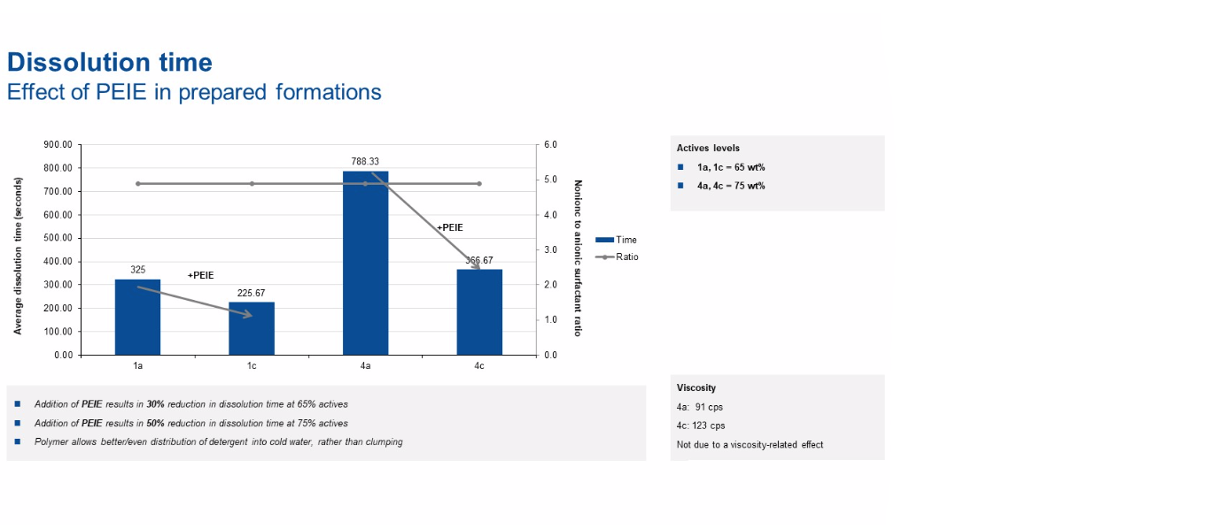 For a detergent to work well it must dissolve in water quickly. This is even more important when you have detergents that are added in concentrated forms into the wash liquor for unit dose applications or other concentrated systems. The polyethyleneimine ethoxylate (PEIE), Sokalan® HP 20, improves the dissolution of the surfactants into the liquid, providing a 30%-50% reduction in cold-water dissolution time.